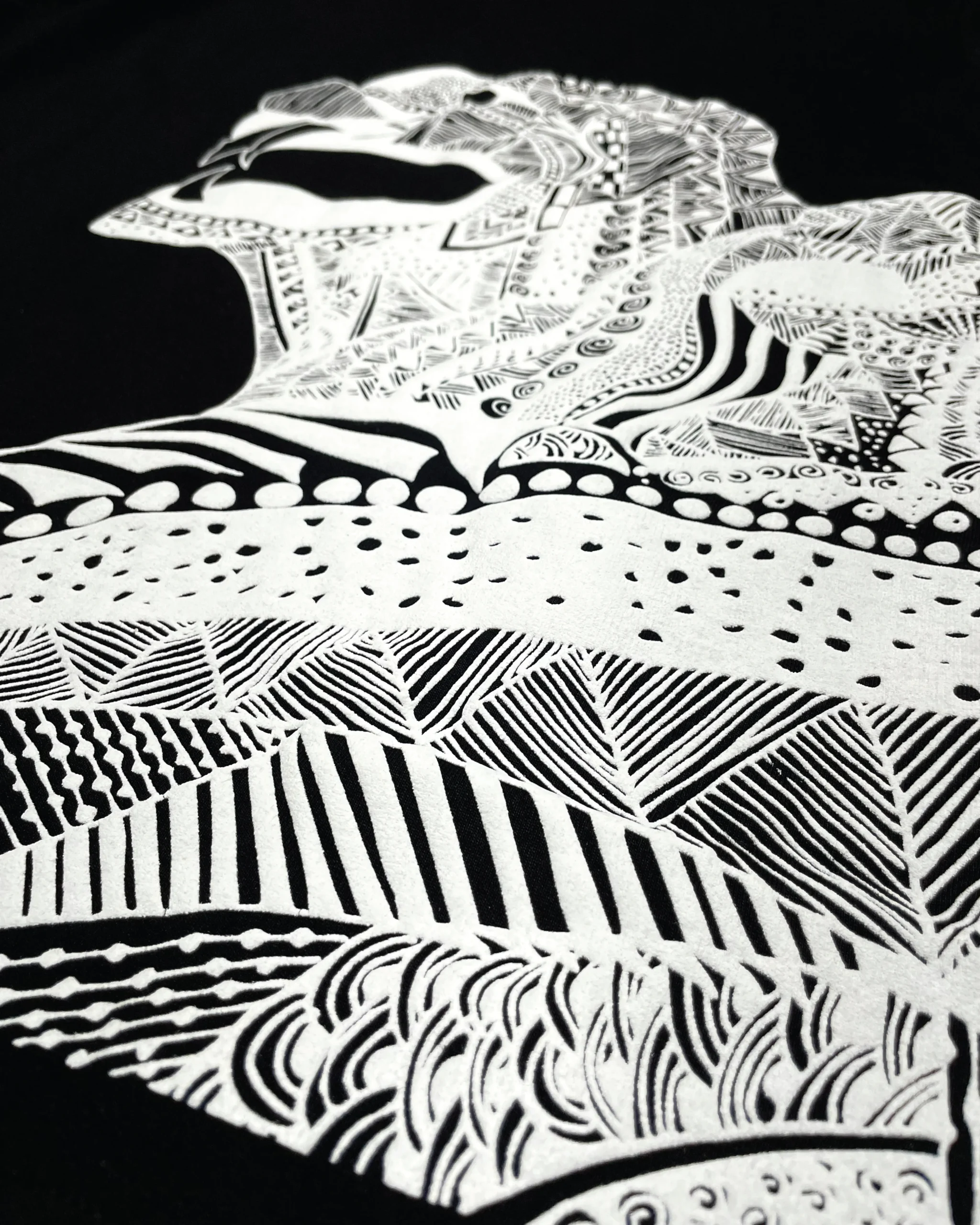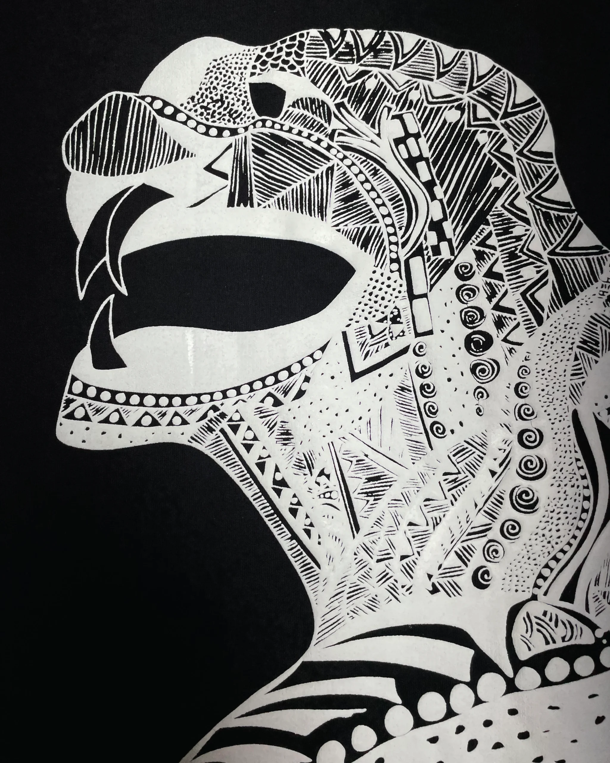 Hand-detailed graphic woven with intricate patterns, layered symbolism, and raw texture.